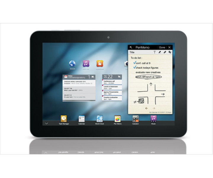 Samsung Galaxy Tab 10.1 gives pure Android 3.0 experience, adding its new TouchWiz UX or TouchWiz 4.0 – includes a live panel, which lets you to customize with different content, such as your pictures, bookmarks, and social feeds, sporting a 10.1 inches WXGA capacitive touch screen with 1280 x 800 pixels of resolution, equipped with 3 megapixel rear camera with LED flash and a 2 megapixel front camera, HSPA+ connectivity up to 21Mbps, 720p HD video recording capability, 1080p HD playback, DLNA support, Bluetooth 2.1, USB 2.0, gyroscope, Wi-Fi 802.11 a/b/g/n, micro-SD slot, 3.5mm headphone jack, and SIM slot, including the Samsung Stick – a Bluetooth microphone that can be carried in a pocket like a pen and sound dock with powered subwoofer.